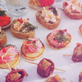 Sit-down dinners are extremely expensive, so you might jettison that banquet in favor of something else. Serve a signature cocktail with a variety of appetizers so guest can mix and mingle at food stations. Plus, a wedding where people can get up and walk around can be more fun and feel less formal. An all-dessert reception is also very popular for late-afternoon weddings, and can feature all your favorites, from cream puffs to cheesecake.